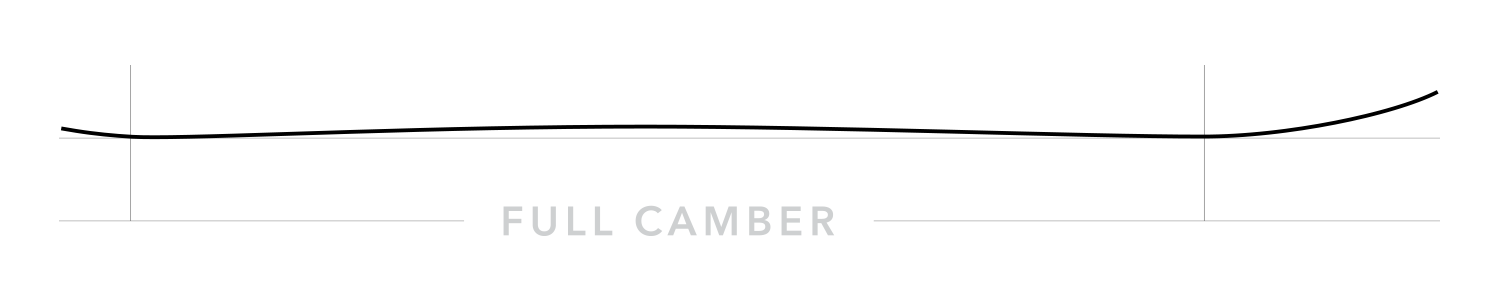 Bullet Train Plus にはフルキャンバーを採用。ノーズからテールまでのしっかりとしたグリップ力と安定性を生み出し、ノーズエリアからの流れるような曲線により柔らかい雪でもスピードと浮力を約束する。通常よりも前に向けたスタンス角度を選ぶことでブーツが雪面と接触することを防ぐ。またいつもより狭いスタンス幅にセットする事で、ボード本来のフレックスを最大限に発揮することができる。